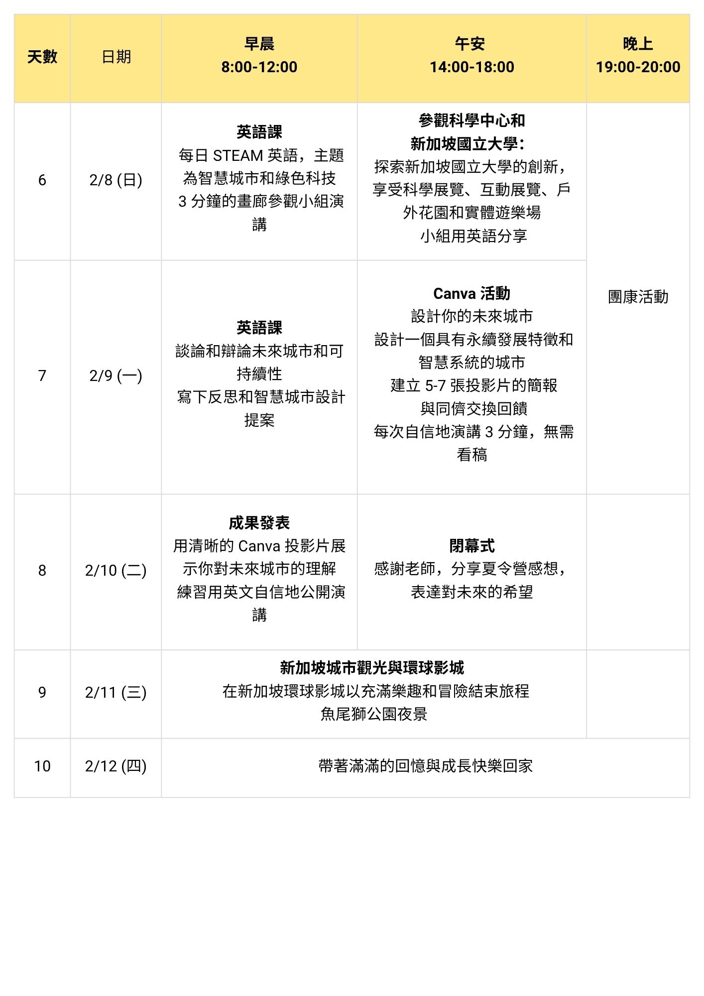 除了核心英語課程,營隊更結合豐富的STEAM挑戰與文化探索活動——從創意科學實驗、科技應用到團隊任務,學員將在新加坡的真實語境中實踐英語,體驗跨國交流的樂趣。